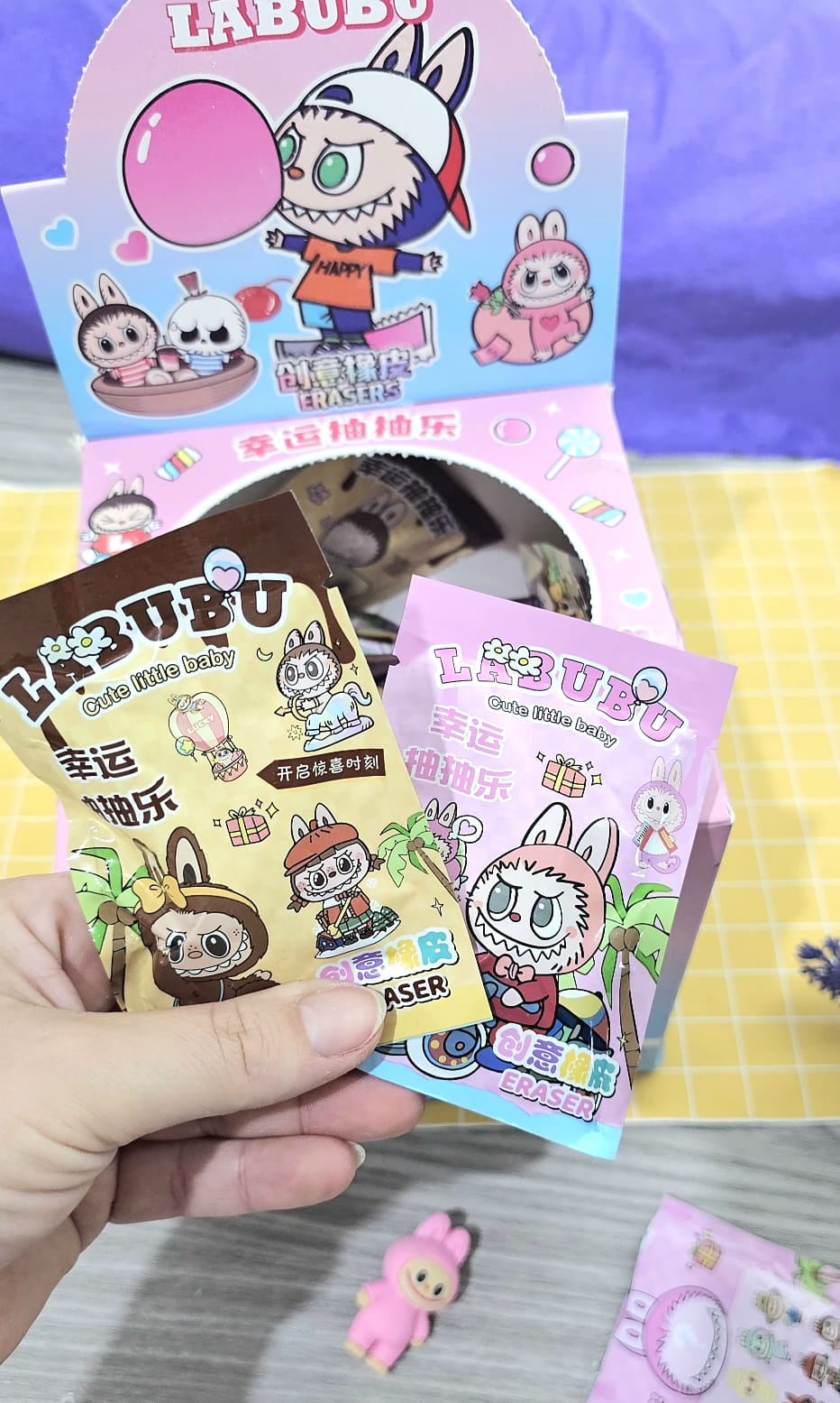 A Borracha Surpresa Labubu vem em embalagem misteriosa, com modelos super fofos para colecionar. Cada unidade é uma surpresa única!